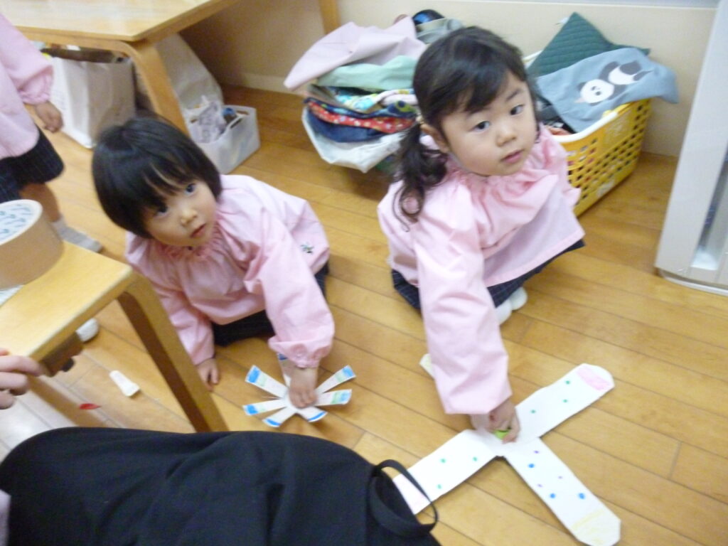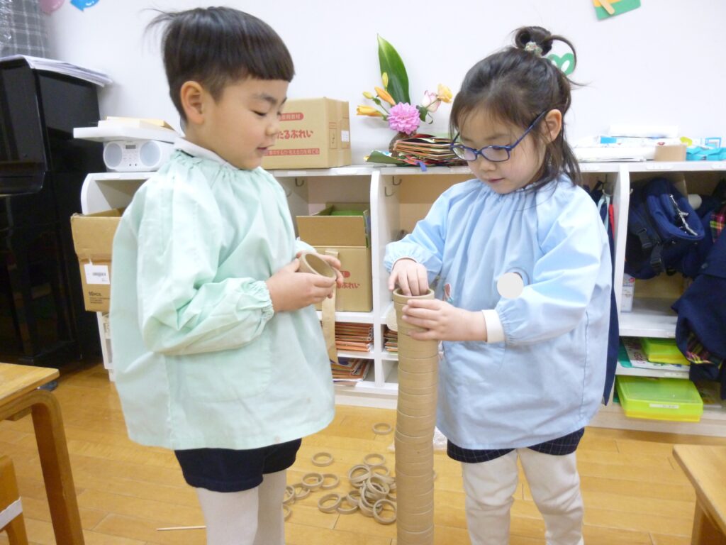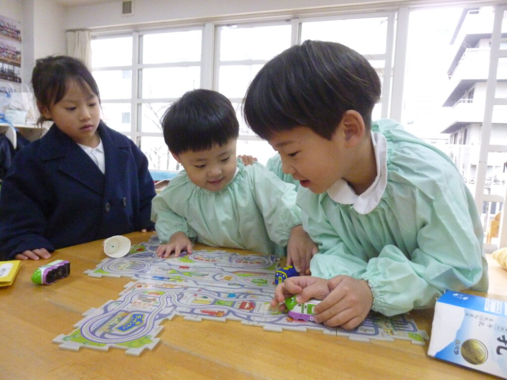 朝の自由遊びでは、少しずつ年少さんが遊びに来てくれるようになりました(*^▽^*)