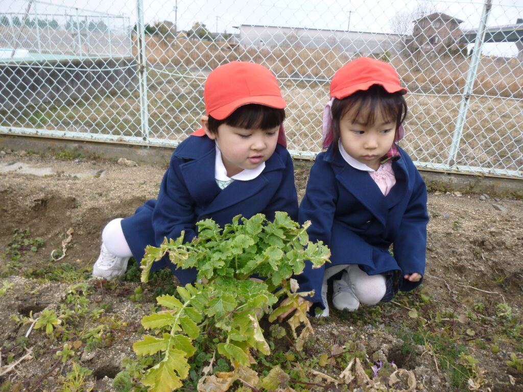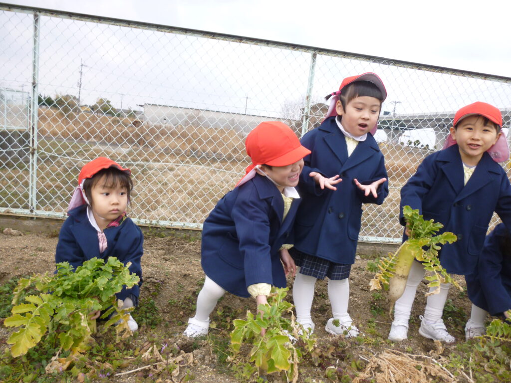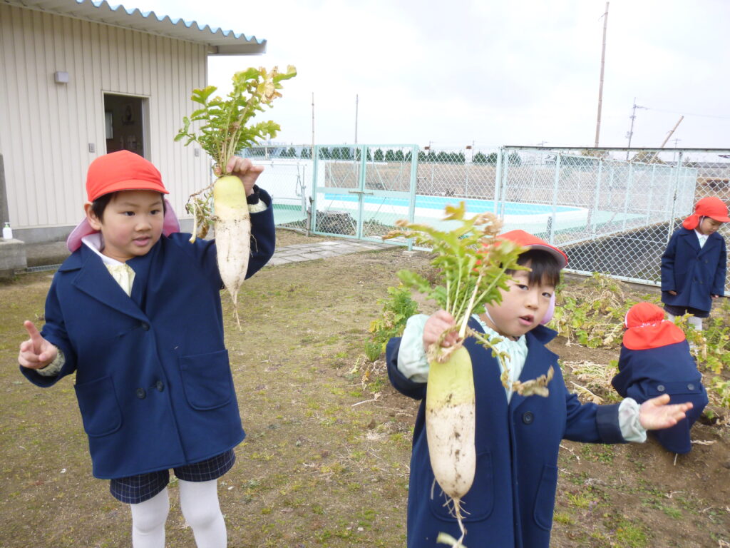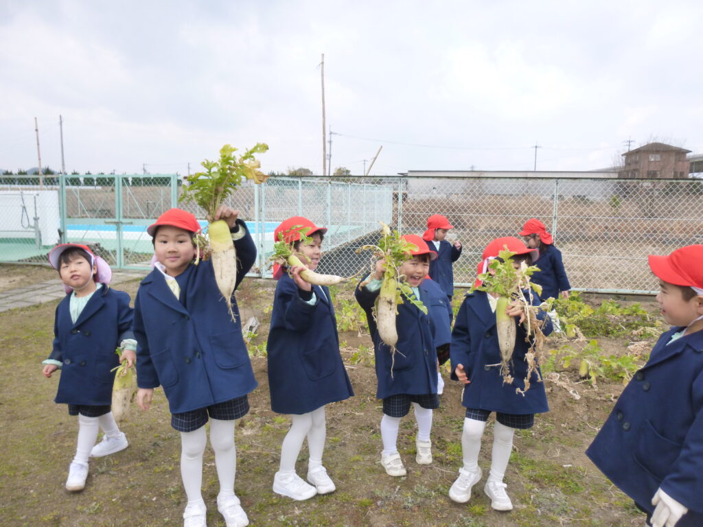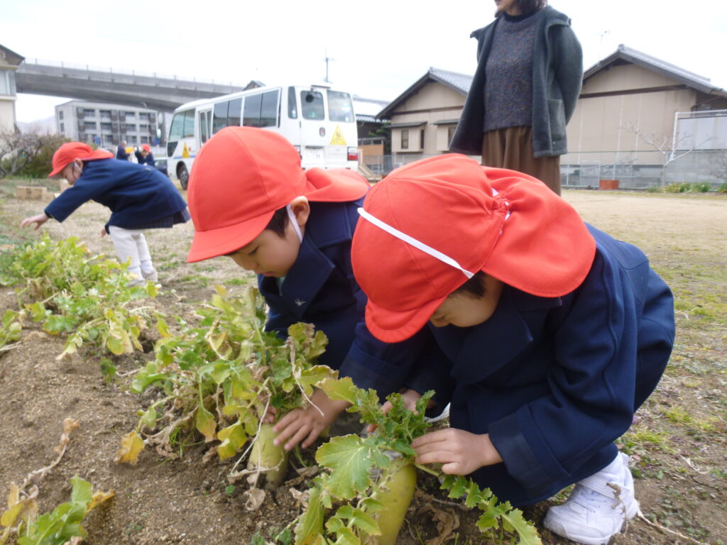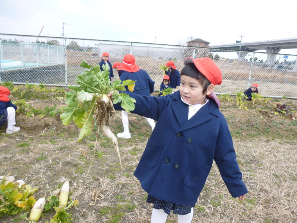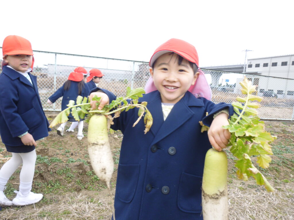 避難訓練の後は、畑で大根収穫です(*’▽’)