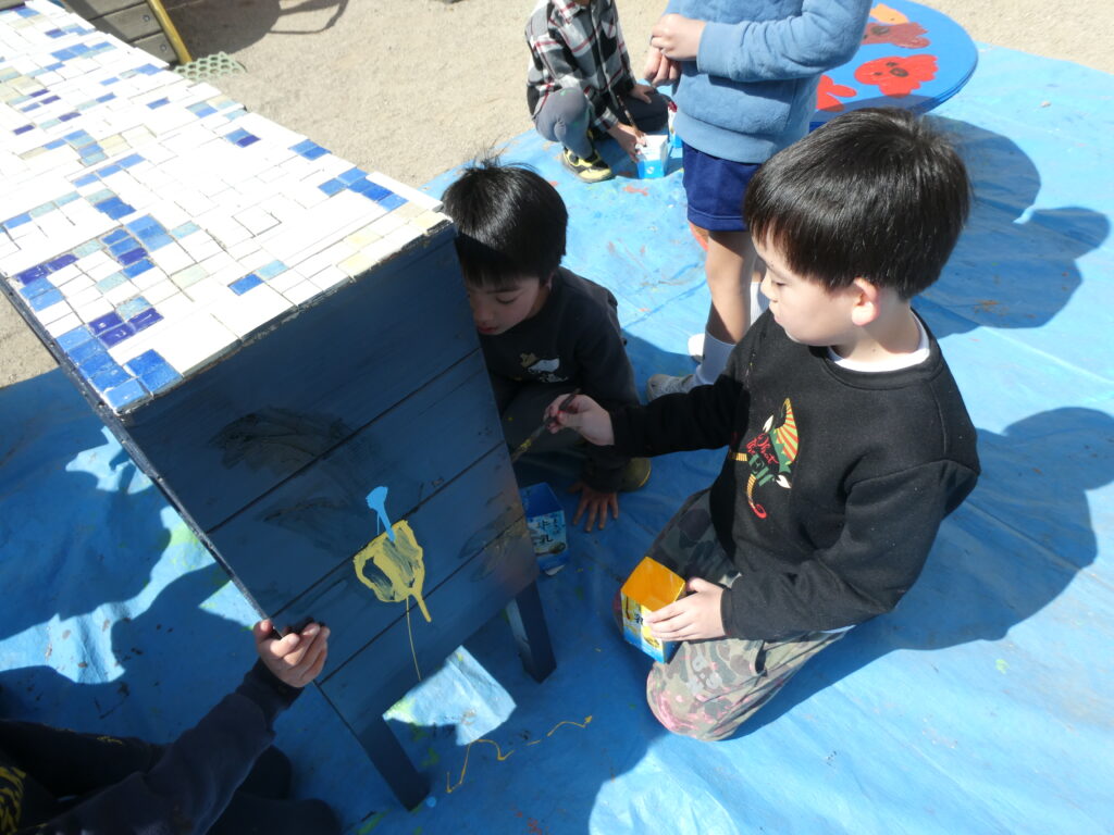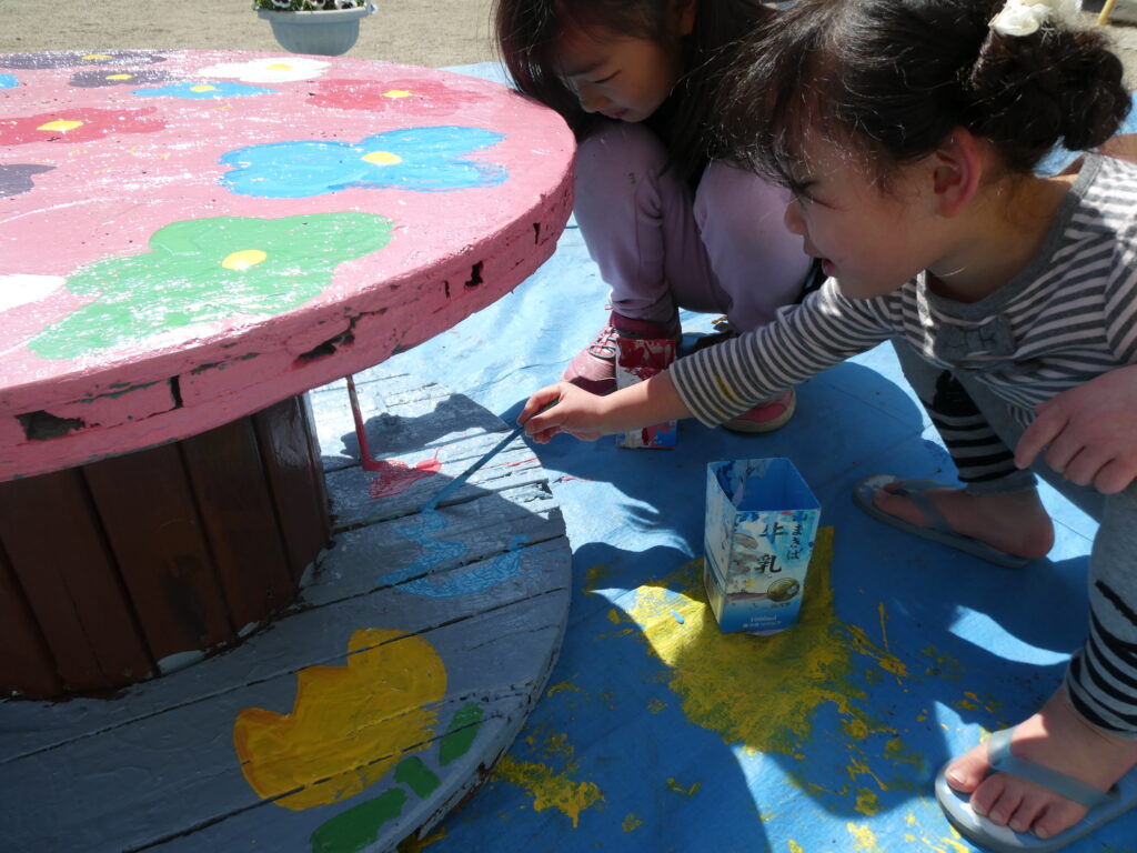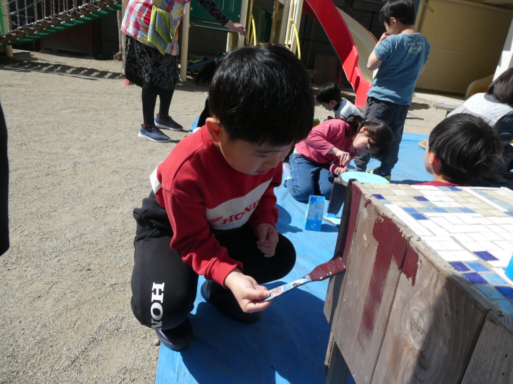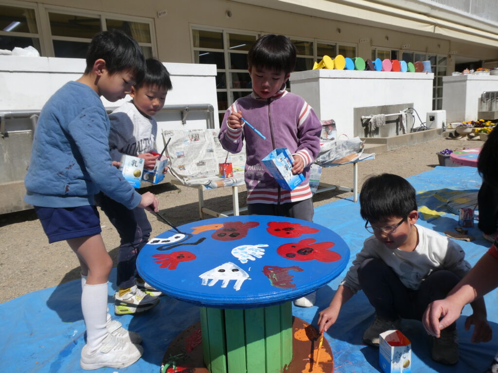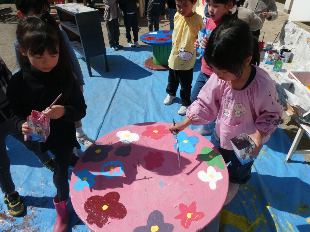 卒園を間近に控えたこの日、年長組で戸外遊び用の机と椅子にペンキを塗りました!!