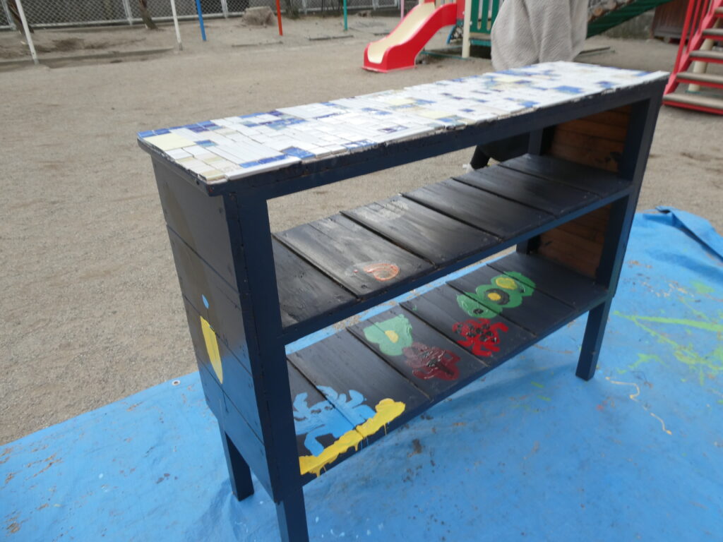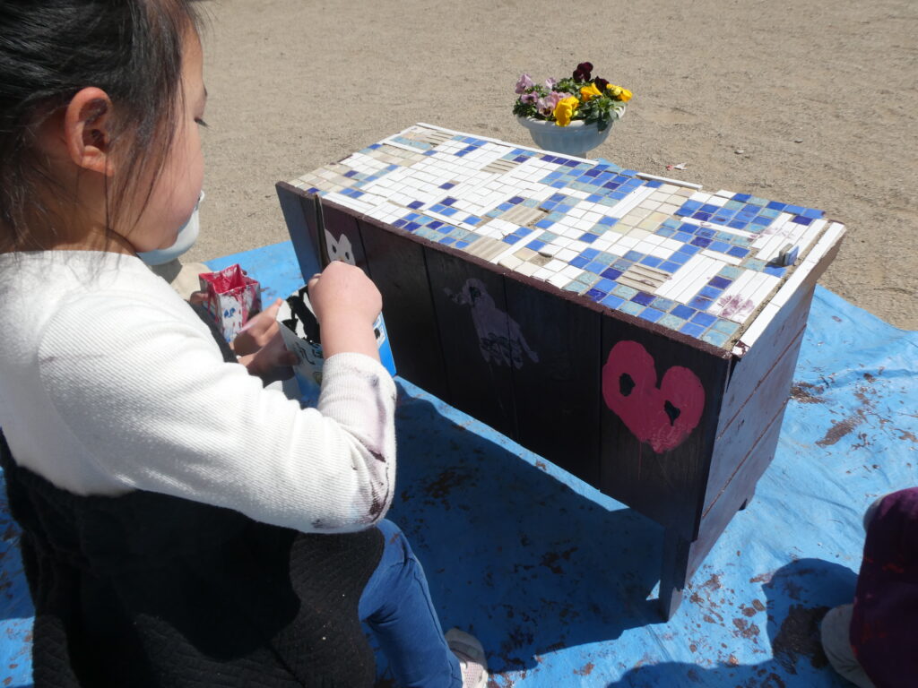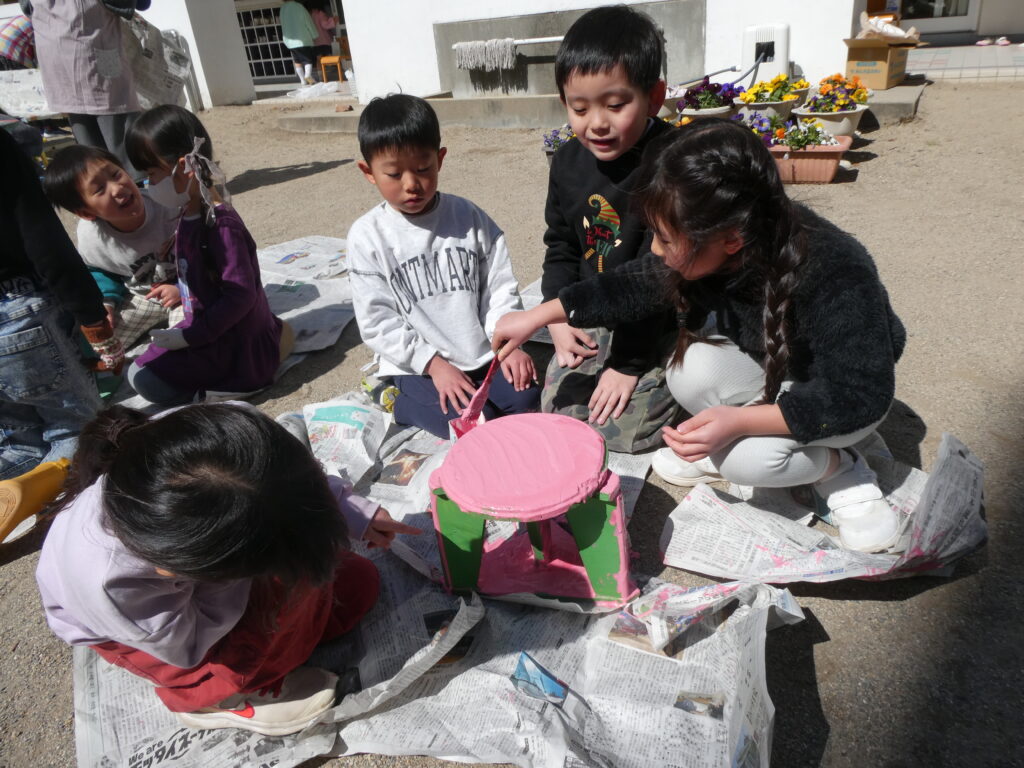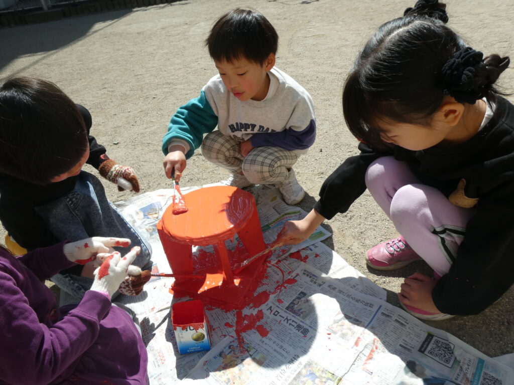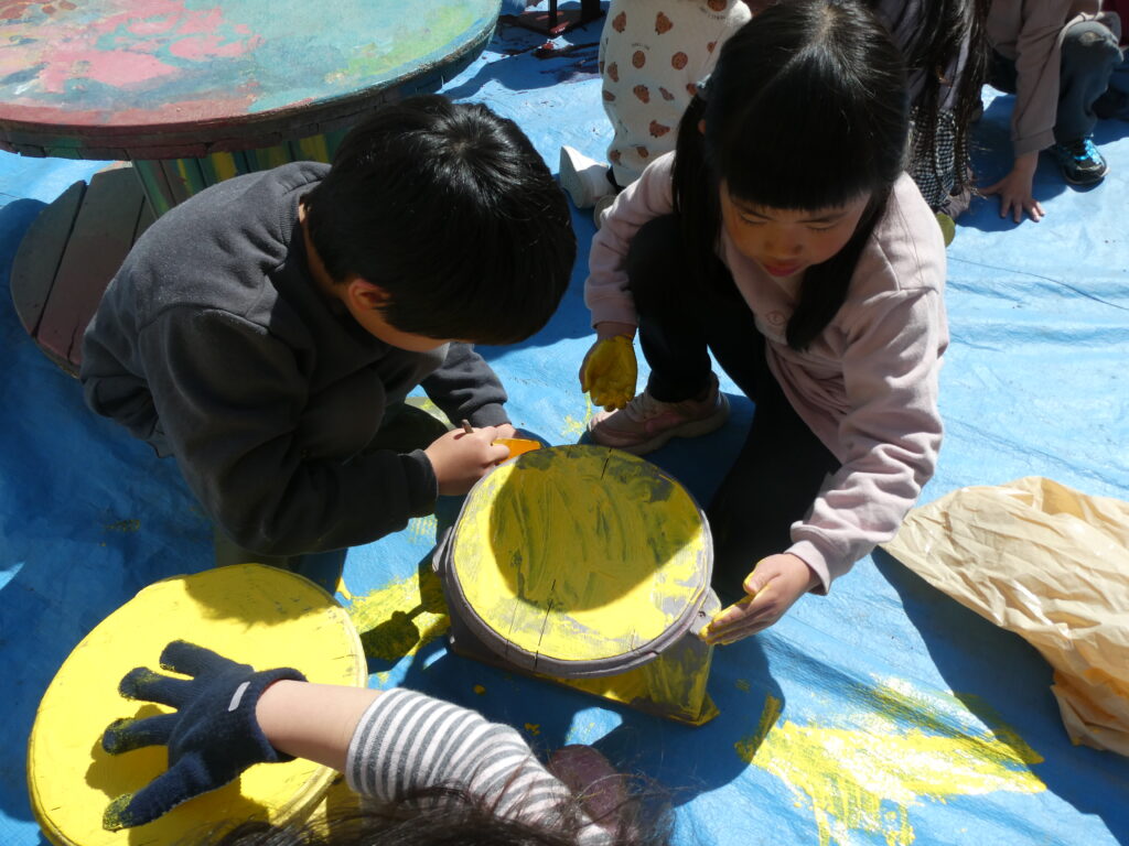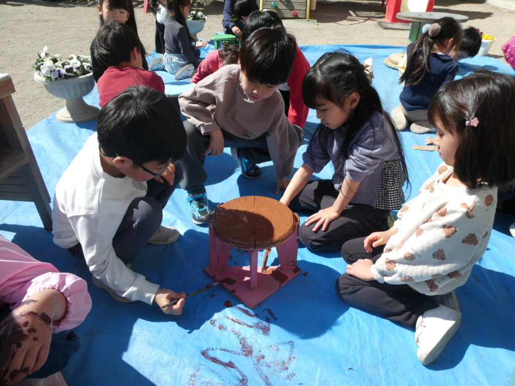 卒園を間近に控えたこの日、年長組で戸外遊び用の机と椅子にペンキを塗りました!!