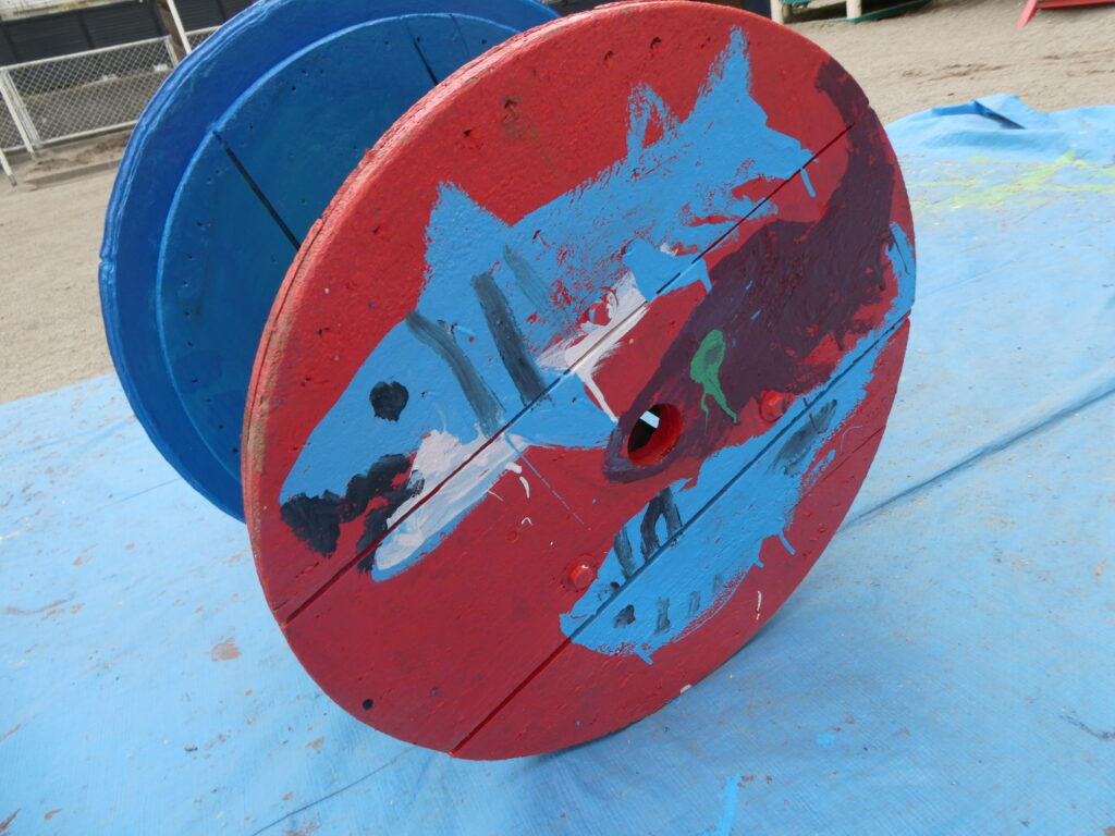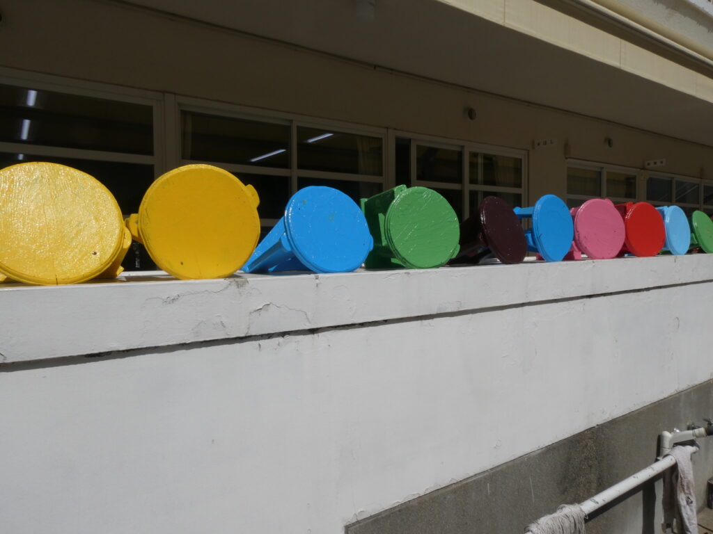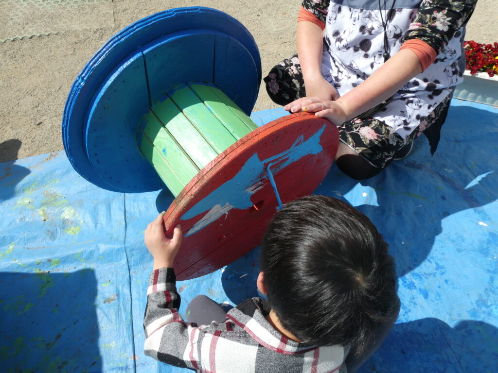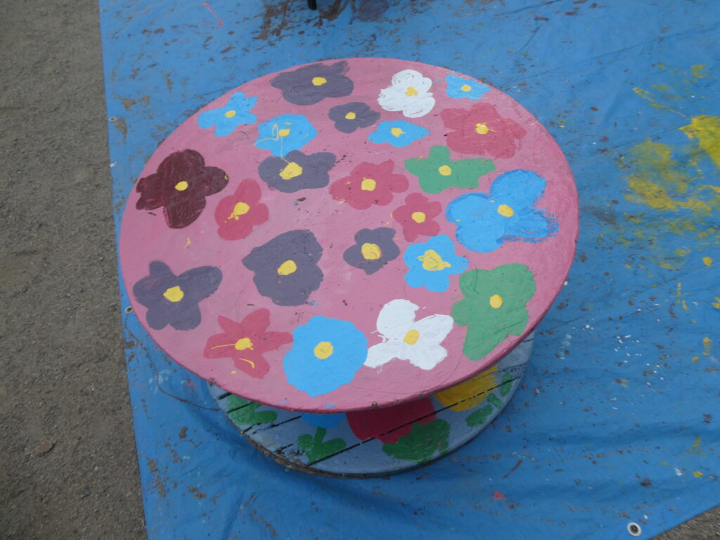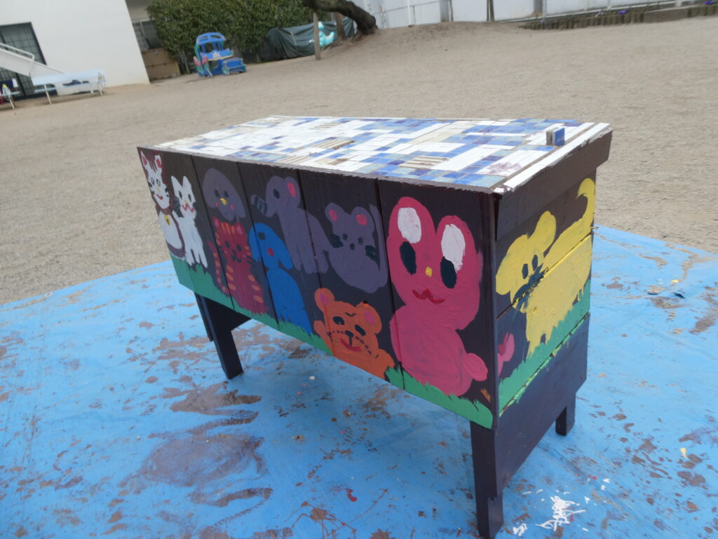 卒園を間近に控えたこの日、年長組で戸外遊び用の机と椅子にペンキを塗りました!!